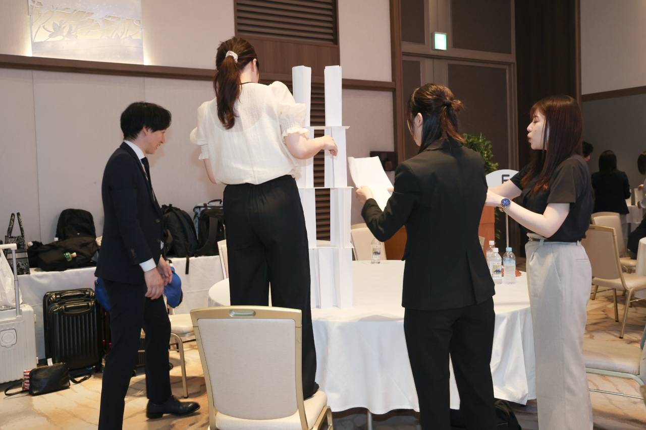 研修の後は、チームで協力しながら競い合うジェスチャーゲームやペーパータワーづくりなどのレクレーションを行いました。普段はなかなか話すことのない他店舗・他エリアのスタッフと声をかけ合いながら、自然とチームワークが生まれてみんな笑顔で盛り上がっていました!